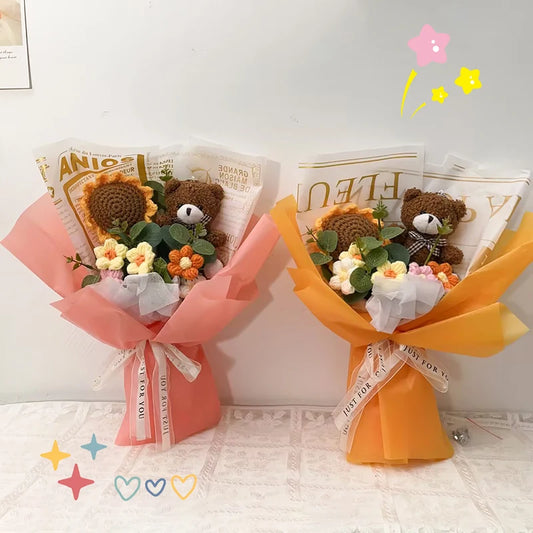Finished Crochet Flowers Bouquet Handmade SunFlower Bouquet Valentines Gift Wedding Decor Knitted Flower Bouquet with Gift Bag